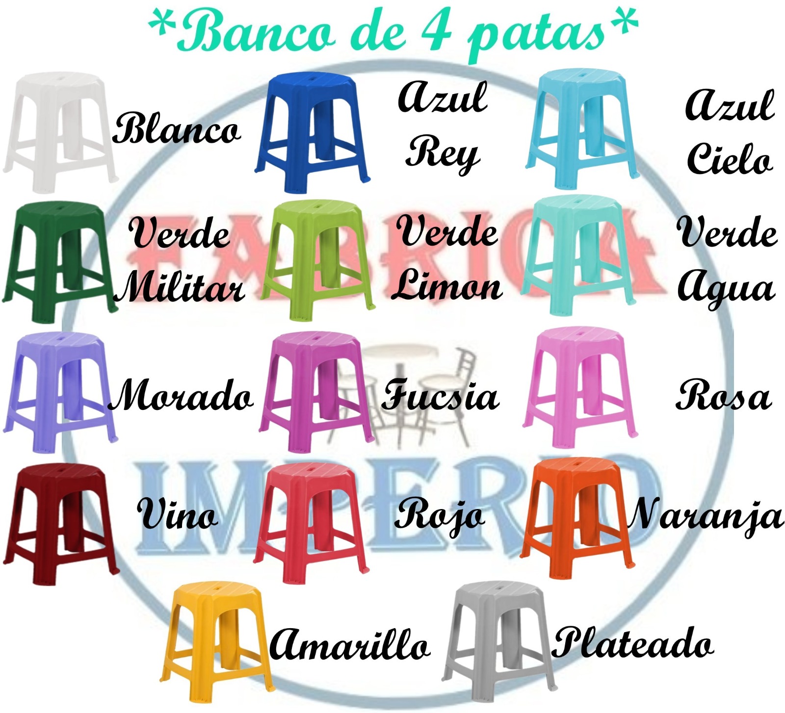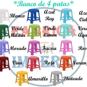 Banco plástico de 4 patas reforzado, disponible en 13 colores diferentes, ideal para ayudarte en tu negocio.